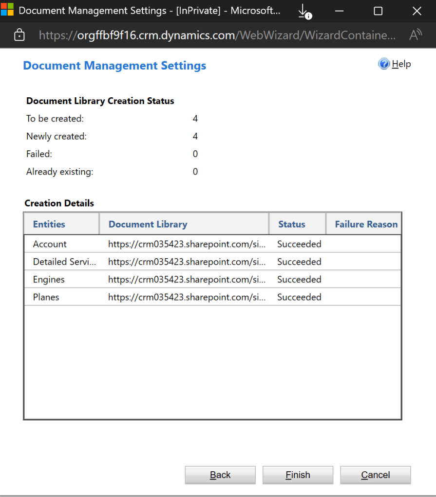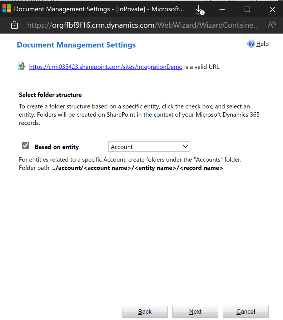 If you want the Sharepoint folder structure created under a specific entity, you can complete the following screen.