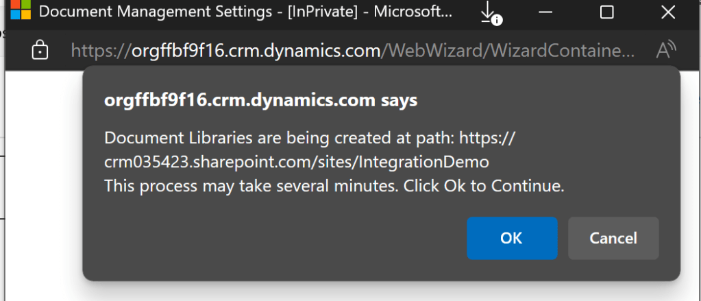 You should then get the message that the Sharepoint Library or libraries are being created. this does take a while. Remember to Click OK if you get this message below.