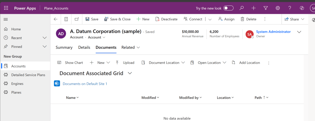 To view you document library in Power platform, create a Model Driven app based on your Table/s. Click on a record in the table and then click on the Related Tab list to see the menu below and choose Documents. (I appreciate those of you are D365 are all shouting at the screen there are other ways… but for first time model driven app users this is an easy way to understand.)
