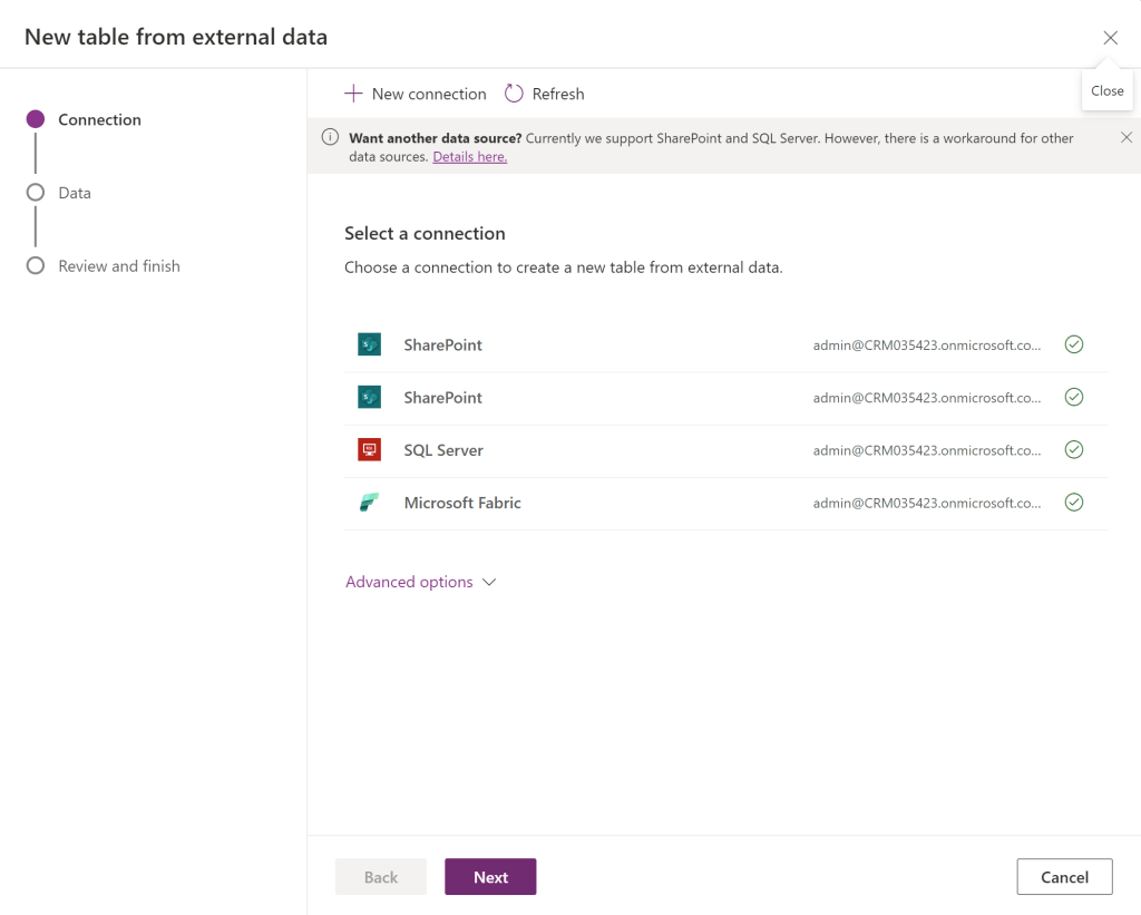You will now see connectors that are available in your environment already. Note:- the new Fabric Connector has appeared. Click on it (its doesn’t highlight when clicked)