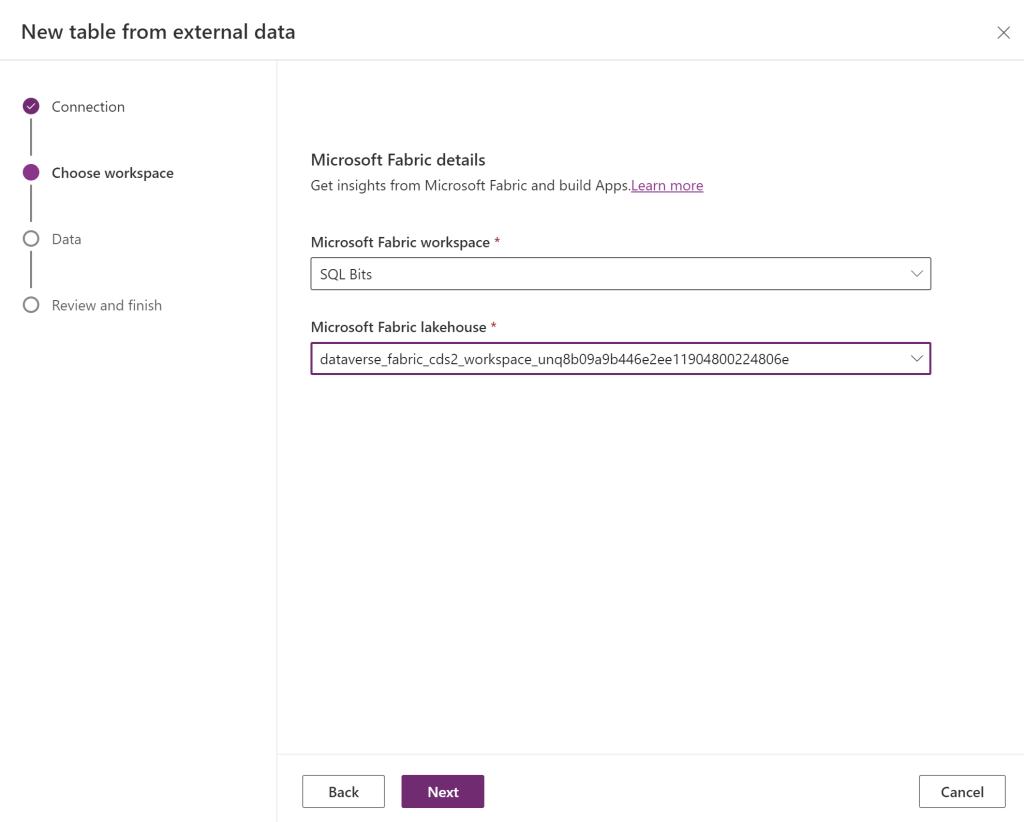 It should now let you choose the fabric workspace and lakehouse you want to connect to.