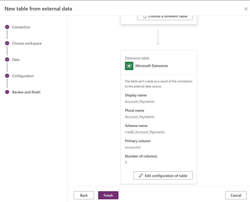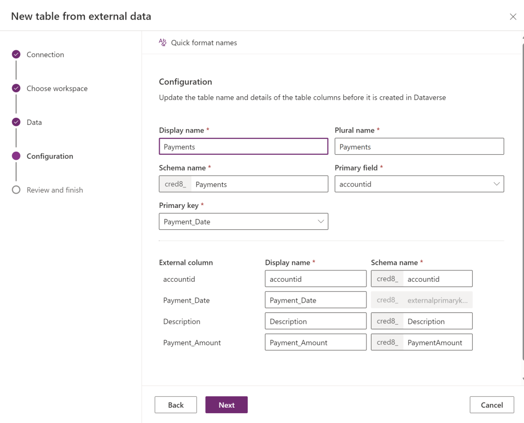 If you ticked “Configure table and column names that will be used in dataverse, you will see this next screen. Where you can edit the table and field mappings